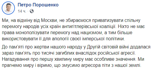 8 мая он опубликовал фото, где мирит ветерана ВОВ и связную УПА. А сегодня показал снимок с могилы своего дедушки-фронтовика, который сражался с немцами в Красной армии. При этом слов "победа" он написал в названии праздника с маленькой буквы и сравнил его с Днем Благодарения в США. Да и не забыл добавить про попытки "приватизации победы", в которых традиционно обвиняют Россию (характерно, что накануне о "приватизации" в контексте 9 мая, рассуждал и Петр Порошенко).