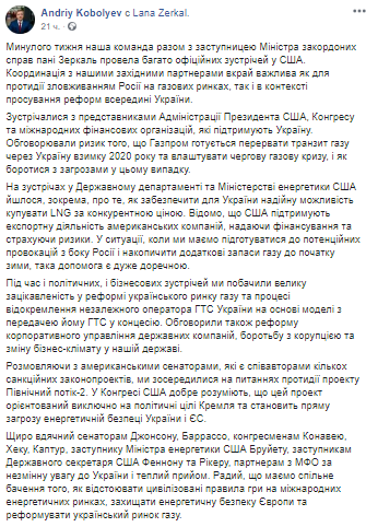 Руководство НАК Нафтогаз Украины и замглавы Министерства иностранных дел Елена Зеркаль провели официальные встречи в США по закупкам американского сжиженного газа (LNG), противодействию Северному потоку-2 и сдаче украинской ГТС в концессию. Об этом на своей странице в соцсети сообщил глава Нафтогаза Андрей Коболев.