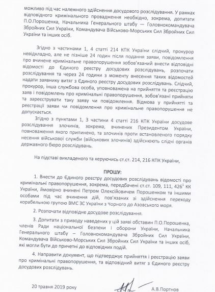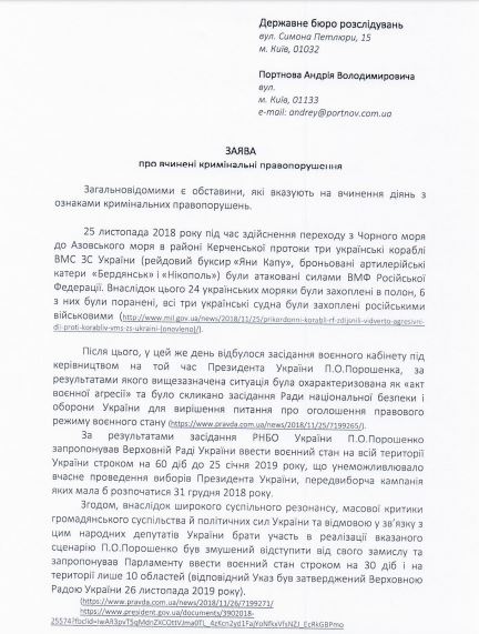 Известный юрист Андрей Портнов, как и обещал, написал в Госбюро расследований заявление о таких преступлениях бывшего президента Петра Порошенко как причастность к государственной измене, попытка захвата власти и превышение власти и служебных полномочий. Об этом Портнов написал в Telegram и привел текст заявления.