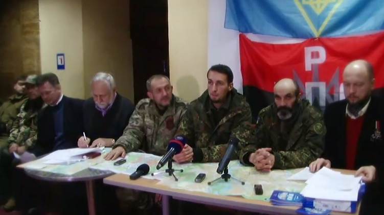 Лидеры акций протеста на своей ночной пресс-конференции в отеле "Козацкий", 17-й канал