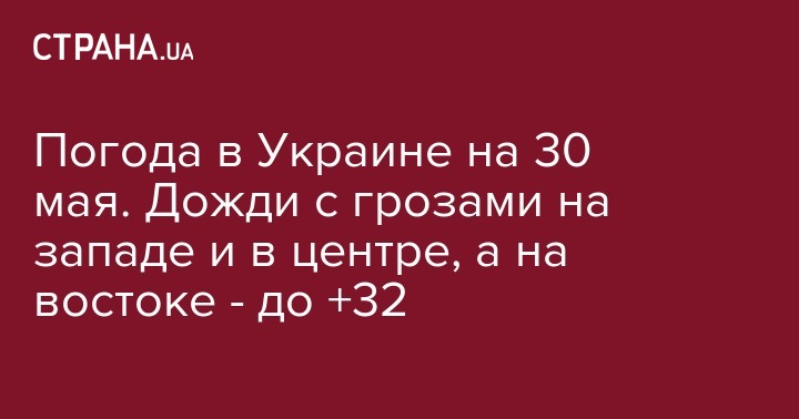 В четверг, 30 мая, в северо-западной и центральной части Украины пройдут дожди с грозами, на остальной территории - сухо и до +32 градусов. Об этом сообщает сайт Укргидрометцентра.