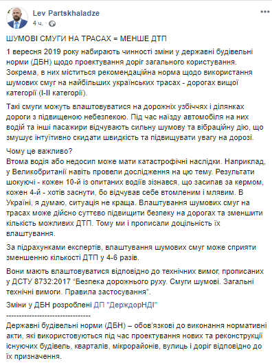 С 1 сентября вступают в силу изменения в государственные строительные нормы по проектированию дорог общего пользования. Осенью может начаться оснащение трасс шумовыми полосами. Об этом на своей страанице в соцсети сообщил заместитель министра регионального развития, строительства и жилищно-коммунального хозяйства Лев Парцхаладзе.