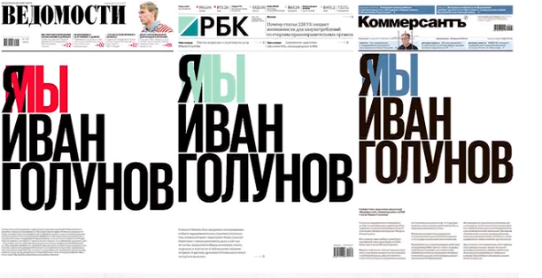 В России три ведущих деловых издания - РБК, Ведомости и Коммерсант - выступили с совместным заявлением в связи с делом журналиста Ивана Голунова, обвиненного в попытке сбыта наркотиков. Первые полосы в печатных версиях изданий впервые будут сделаны в единой стилистике. Об этом сообщает сайт РБК.
