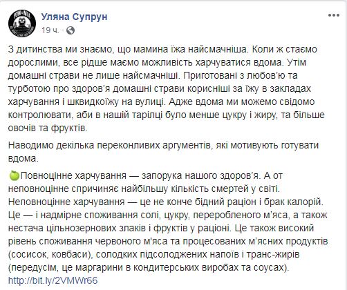 И.о. главы Минздрава Ульяна Супрун рассказала о пользе приготовленной дома еды и вредности перекусов на улице, в том числе, шаурмой, которую так распиарил президент Владимир Зеленский. Свои советы она разместила в Facebook.