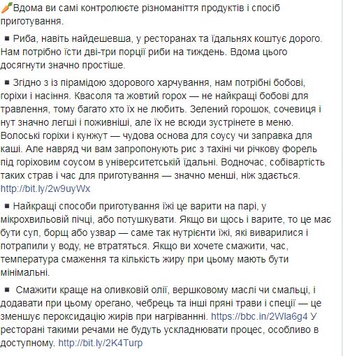 Дома можно самостоятельно контролировать многообразие продуктов и способ их приготовления. "Согласно пирамиды здорового питания, нам нужны бобовые, орехи и семена. Фасоль и желтый горох - не лучшие бобовые для пищеварения, поэтому многие их не любит. Зеленый горошек, чечевица и нут значительно легче и питательные, но их не везде встретите в меню. Грецкие орехи и кунжут - прекрасная основа для соуса или заправка для каши. Но вряд ли вам предложат рис с тахини или речную форель под ореховым соусом в университетской столовой. В то же время, себестоимость таких блюд и время для приготовления - значительно меньше, чем кажется", - говорится в сообщении