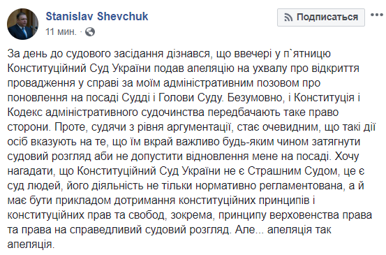 "Безусловно, и Конституция, и Кодекс административного судопроизводства предусматривают такое право стороны. Однако, судя по уровню аргументации, становится очевидно, что такие действия лиц указывают на то, что им крайне важно каким-либо образом затянуть судебное рассмотрение, дабы не допустить восстановления меня в должности", - отметил Шевчук.