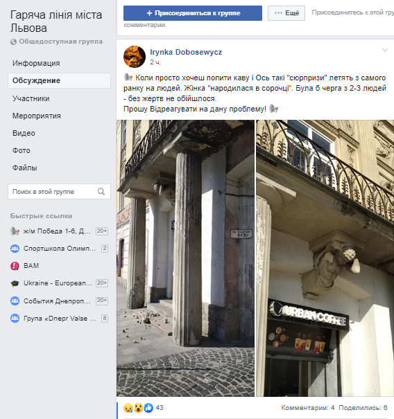 Как сообщила в группе "Горячая линия города Львова" в Facebook, инцидент произошел утром во вторник, 11 июня, в самом центре Львова на проспекте Свободы, 1/3, возле уличного кафе. Прямо возле женщины, которая остановилась возле Urban Cafe выпить кофе, упала часть элементов балкона.