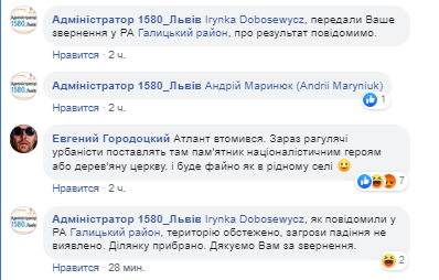 В комментариях к публикации администратор группы написал, что "данное обращение передано для реагирования в Галицкую районную администрацию города". Позже администратор также отметил, что райадминистрации сообщили об обследовании территории, угрозы падения других конструкций не выявлено, а рухнувший бетонн уже убрали.