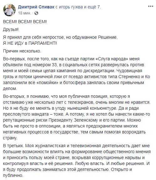 Бывший депутат Одесского горсовета, блогер и ведущий на телеканале NewsОne Дмитрий Спивак заявил, что не идет в парламент по списку партии президента "Слуга народа", в котором он присутствовал под номером 33. Об этом он сообщил в Facebook. По его словам, причин такого решения было несколько.