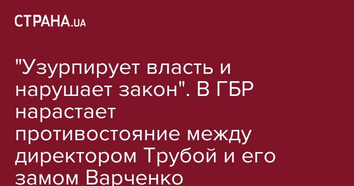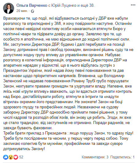 Первый заместитель директора Государственного бюро расследований Ольга Варченко заявила, что Роман Труба, возглавляющий ГБР, узурпирует власть и нарушает закон. Об этом она сообщила на странице в Facebook.