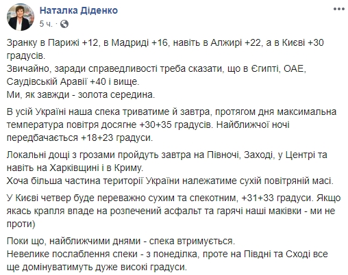 Синоптик Наталья Диденко прогнозирует, что во всей Украине жара продлится и завтра, в течение дня максимальная температура воздуха достигнет + 30 + 35 градусов. Ближайшей ночью предполагается + 18 + 23 градуса.
