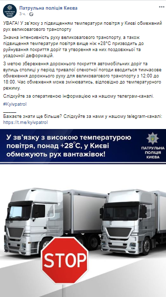 А с 11 июня из-за повышения температуры воздуха в Киеве ввели временное ограничение дорожного движения для тяжеловесного транспорта.