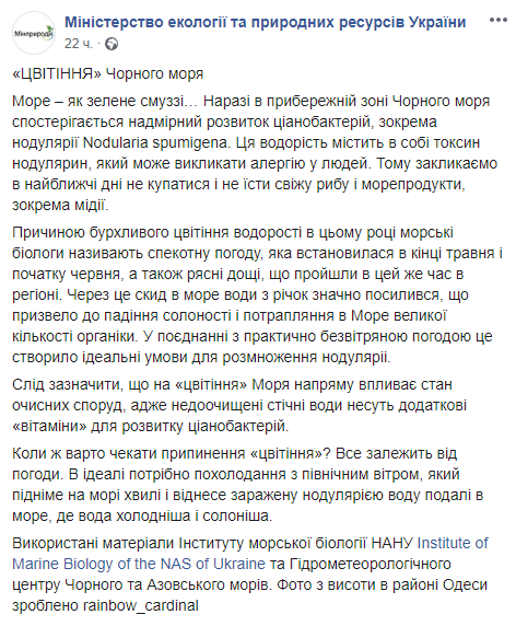 У Гройсмана уже призвали не купаться в Одесском заливе и не есть морепродукты. "Сейчас в прибрежной зоне Черного моря наблюдается чрезмерное развитие цианобактерий, в частности нодулярии Nodularia spumigena. Эта водоросль содержит в себе токсин нодулярин, который может вызвать аллергию у людей. Поэтому призываем в ближайшие дни не купаться и не есть свежую рыбу и морепродукты, в частности мидии" , - отмечается в обращении Минэкологии.