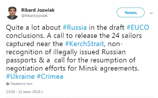 По его информации, в проекте решения по итогам саммита будет немало упоминаний о России. В частности, главы правительств и государств ЕС призовут Москву освободить содержащихся в РФ 24 украинских моряков, захваченных в районе Керченского пролива. Лидеры Евросоюза заявят также о непризнании выданных Россией паспортов для украинцев (речь, видимо, идет о Донбассе - прим. ред.) и призовут к возобновлению переговорных усилий с целью реализации Минских соглашений.