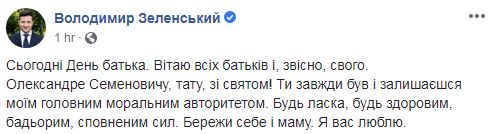 "Сегодня День отца. Поздравляю всех отцов и, конечно, своего", - написал Зеленский.