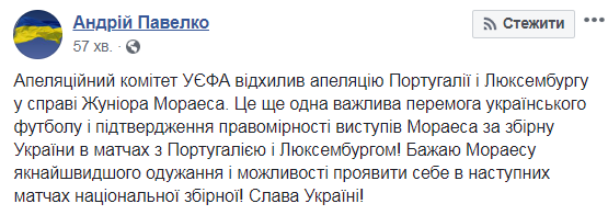 "Апелляционный комитет УЕФА отклонил апелляцию Португалии и Люксембурга по делу Жуниора Мораеса. Это еще одна важная победа украинского футбола и подтверждение правомерности выступлений Мораеса за сборную Украины в матчах с Португалией и Люксембургом! Желаю Мораесу скорейшего выздоровления и возможности проявить себя в следующих матчах национальной сборной! Слава Украине!", - написал президент УАФ.