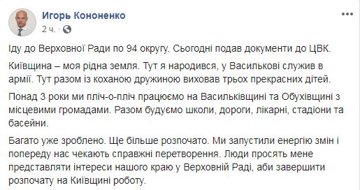 Сам Кононенко, тем временем, сообщил, что сегодня, 19 июня подал документы в ЦИК. Он утверждает, что выбрал именно 94 округ, потому что там его родная земля.