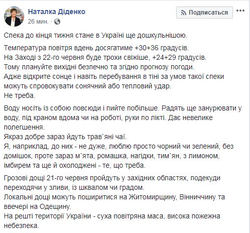 На западе с 22-го июня будет немного свежее, +24...+29 градусов, но здесь пройдут грозовые дожди, местами переходя в ливни, с шквалом или градом. "Локальные дожди могут распространиться на Житомирщину, Винницкую область и вечером в Одесскую область", - добавляет Диденко. На остальной территории Украины - сухая воздушная масса, высокая пожарная опасность.