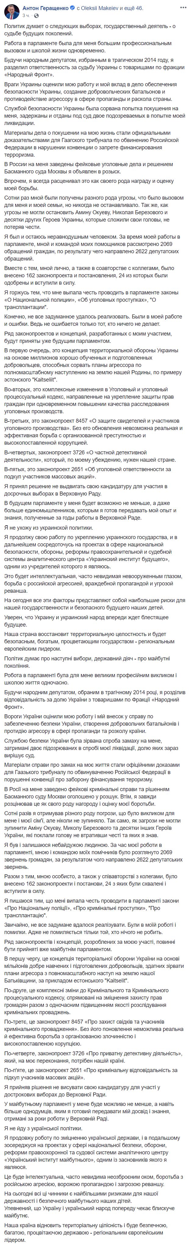 "Я принял решение не выдвигать свою кандидатуру для участия в досрочных выборах в Верховную Раду. В будущем парламенте у меня будет возможно не меньше, а даже больше единомышленников, которым я готов передавать мой опыт и знания, полученные за годы работы в Верховной Раде", - написал Геращенко.