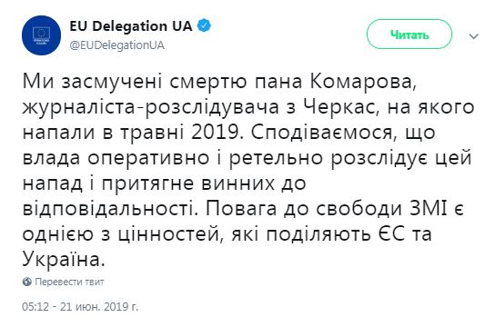 "Мы опечалены смертью господина Комарова, журналиста-расследователя из Черкасс, на которого напали в мае 2019 года. Надеемся, что власти оперативно и тщательно расследуют это нападение и привлекут виновных к ответственности. Уважение к свободе СМИ является одной из ценностей, которые разделяют ЕС и Украина", - отмечается в сообщении.