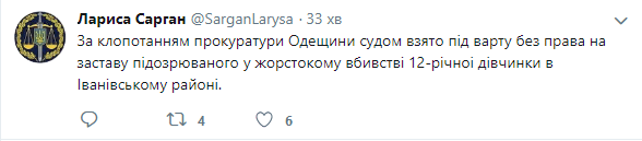 "По ходатайству прокуратуры Одесской области суд взял под стражу без права на залог подозреваемого в жестоком убийстве девочки в Ивановском районе", - написала спикер ГПУ Лариса Сарган.