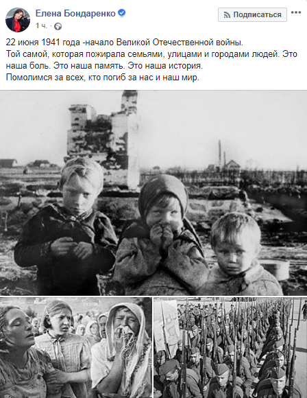 "22 июня 1941 года -начало Великой Отечественной войны. Той самой, которая пожирала семьями, улицами и городами людей. Это наша боль. Это наша память. Это наша история. Помолимся за всех, кто погиб за нас и наш мир", - написала экс-депутат Елена Бондаренко.
