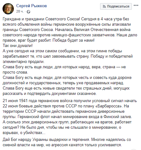 Так они думали! А уже сегодня на этом самом сообщении, на этом гимне победы зарабатывают те, кто шел завоевывать страну. Победу и победителей элементарно продали.  Слава Богу есть еще люди, для которых народ, вера, страна — не просто слова.  Слава Богу есть еще люди, для которых честь и совесть куда дороже должностей и государственных, теперь уже продаваемых наград. Слава Богу еще есть живые свидетели тех страшных дней, могущих рассказать и подтвердить документами сказанное...." - написал он.