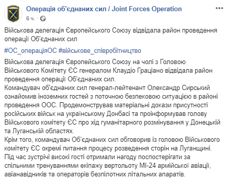 "Командующий объединенных сил генерал-лейтенант Александр Сирский ознакомил иностранных гостей с текущей политикой безопасности ситуацией в районе проведения ООС. Продемонстрировал материальные доказательства присутствия российских войск на украинском Донбассе и проинформировал председателя Военного комитета ЕС о ходе гуманитарного разминирования в Донецкой и Луганской областях", - сказано в сообщении.