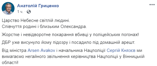 "Жесткое и неотвратимое наказание убийцы в полицейских погонах! ГБР уже выдвинуло ему подозрение и посадило под домашний арест. От министра МВД Арсена Авакова и начальника Нацполиции Сергея Князева мы требуем немедленного увольнения руководства Нацполиции в Винницкой области!", - заявил Гриценко.