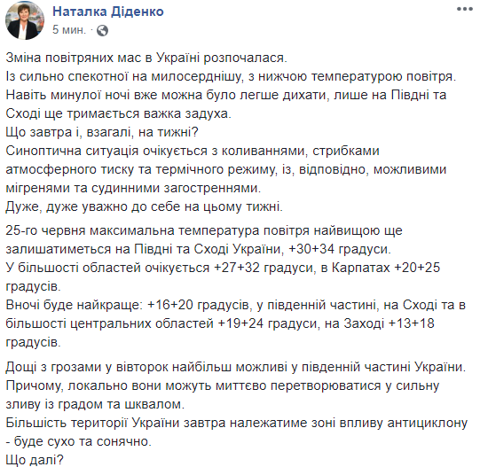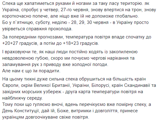 "Жара продолжит хвататься руками и ногами за такую ​​лакомую территорию, как Украина. Попытается в четверг, 27 июня, снова удержаться на трон, снова кратковременно припечет, но ничто уже жаре не поможет глобально. Поскольку в пятницу, субботу, воскресенье - 28, 29, 30 июня - в Украине просто начнется настоящая прохлада", - пишет Диденко.