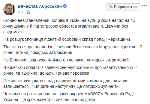 "Отбросы издеваются над нашими детьми каждый день, вопрос остается - чей ребенок следующий? Это нужно остановить. Ждем рассмотрение нашего законопроекта №6607 в Верховной Раде Украины. Это шаг навстречу безопасности наших детей", – отметил Аброськин.