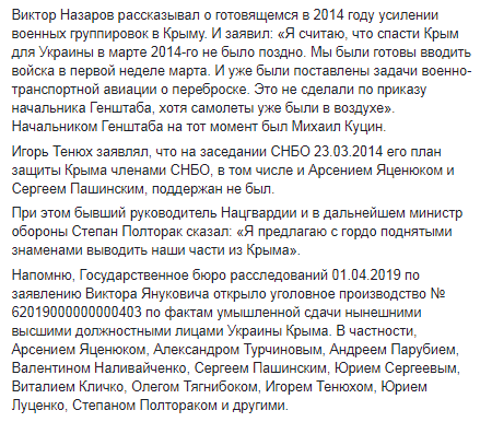 Виктор Назаров рассказывал о готовящемся в 2014 году усилении военных группировок в Крыму. И заявил: "Я считаю, что спасти Крым для Украины в марте 2014-го не было поздно. Мы были готовы вводить войска в первой неделе марта. И уже были поставлены задачи военно-транспортной авиации о переброске. Это не сделали по приказу начальника Генштаба, хотя самолеты уже были в воздухе". Начальником Генштаба на тот момент был Михаил Куцин.