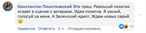 "Это трэш. Реальный политик играет в сценке с актерами. Идея понятна. Я умный, голосуй за меня. А Зеленский идиот. Ждем новых серий".