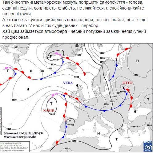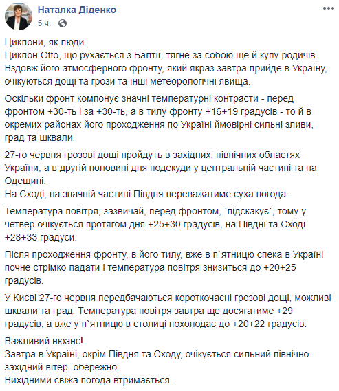 В Украину уже на днях придет циклон Otto, который движется из Прибалтики. Вдоль его атмосферного фронта, который придет в страну 27 июня, ожидаются дожди и грозы и другие метеорологические явления. Об этом сообщает синоптик Наталья Диденко на своей странице в Facebook.