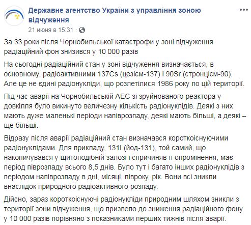 В Госагентстве отмечают, что сразу после аварии радиационное состояние определялось недолго живущими  радионуклидами. Для примера, 131И (йод-131), тот же, что накапливался в щитовидной железе и вызывал ее облучение, имеет период полураспада всего 8,5 дней. Было здесь и много других радионуклидов с периодом полураспада в дни, месяцы, полгода, год. Они все исчезли вследствие естественного радиоактивного распада", - подчеркивается в сообщении.