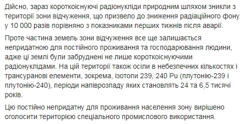 "Однако часть земель зоны отчуждения все еще остается непригодной для постоянного проживания и хозяйствования человека, ведь эти земли были загрязнены не только короткоживущими радионуклидами. На этой территории также осели в опасных количествах и трансурановые элементы, в частности изотопы 239, 240 Pu (плутония-239 и плутония-240), периоды полураспада которых составляют 24 и 6,5 тысячи лет", - пишет Госагентство.