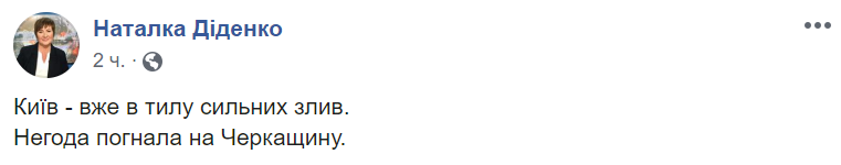 Киев уже в тылу сильных ливней, теперь непогода идет в сторону Черкасской области. Об этом на своей странице в социальной сети сообщила синоптик Наталья Диденко.