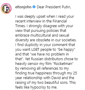 "Я был глубоко расстроен, когда прочитал ваше недавнее интервью в Financial Times. Я категорически не согласен с вашим мнение о том, что политика мультикультурализма и сексуального разнообразия в нашем обществе устарела. Я вижу двуличие в ваших словах, когда вы говорите о том, что хотите, чтобы ЛГБТ "были счастливы" и что "у вас нет проблем с этим". Тем не менее российские дистрибьюторы решили подвергнуть жесткой цензуре мой фильм "Рокетмен", удалив все упоминания о моем обретении истинного счастья благодаря 25-летним отношениям с Дэвидом и воспитанию двух прекрасных сыновей. Мне кажется, что это лицемерие", - заявил Элтон Джон.