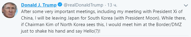 В своем Twitter Трамп также предложил Ким Чен Ыну встретиться в демилитаризованной зоне, чтобы "пожать руку и сказать "привет".