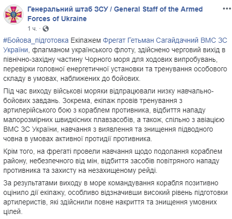 В субботу, 29 июня, экипаж фрегата "Гетьман Сагайдачный" Военно-морских сил Вооруженных сил Украины провел боевые учения в Черном море. Об этом сообщает Генштаб ВСУ.