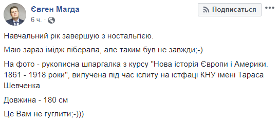 "Учебный год завершаю с ностальгией. Сейчас у меня имидж либерала, но таким был не всегда. На фото – рукописная работа по курсу "Новая история Европы и Америки. 1861–1918 годы", изъятая во время экзамена на истфаке КНУ имени Тараса Шевченко. Длина – 180 см. Это вам не гуглить", – прокомментировал он фото.