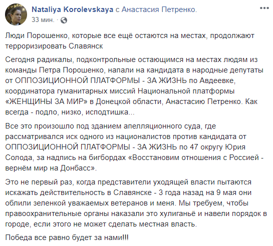 По словам Королевской, радикалы, подконтрольные людям из команды Петра Порошенко, напали на Анастасию Петренко внезапно. "Мы требуем, чтобы правоохранительные органы наказали это хулиганье и навели порядок в городе, если этого не может сделать местная власть", - написала нардеп Наталья Королевская.