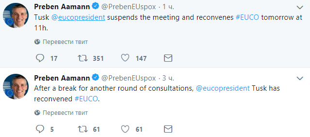 "Председатель Европейского совета Туск приостанавливает встречу и возобновит работу Евросовета завтра в 11 часов", - написал пресс-секретарь в понедельник в Twitter. Пресс-служба Евросовета также сообщила, что запланированная на понедельник пресс-конференция Туска отменена.