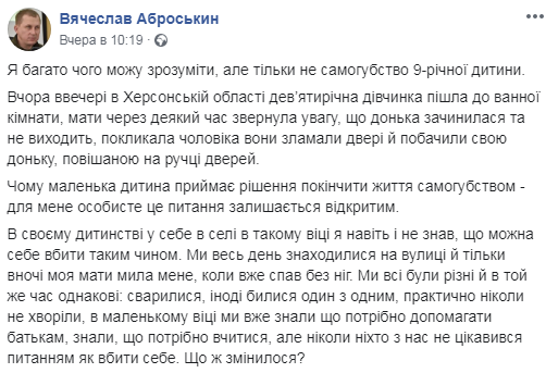 30 июня в Херсонской области покончила с собой 9-летняя девочка. Об этом сообщил в Facebook начальник криминальной полиции Украины Вячеслав Амброськин. По его словам, девочка пошла в ванную комнату. А через некоторое время мать обратила внимание, что дочь закрылась и не отзывается. Она позвала мужа, они взломали дверь и увидели, что девочка повесилась на ручке двери.