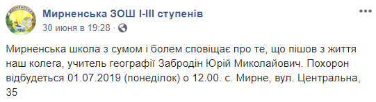 "Мирненская школа с грустью и болью извещает о том, что ушел из жизни наш коллега, учитель географии Забродин Юрий Николаевич. Похороны состоится 01.07.2019 (понедельник) в 12.00. с. Мирное, ул. Центральная, 35", - говорится в сообщении.