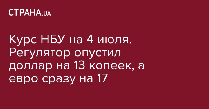 Кроме того, регулятор снизил курс евро на 17 копеек до 29,41 гривен за евро. Официальный курс евро на 4 июля установлен на уровне 2941,2439 гривни за 100 евро (-17,2486 грн).