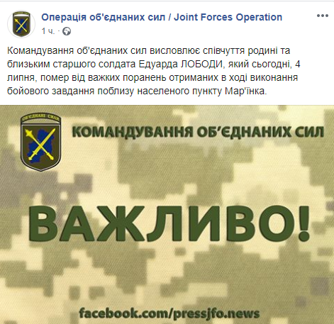 "Командование объединенных сил выражает соболезнования семье и близким старшего солдата Эдуарда Лободы, который сегодня, 4 июля, скончался от тяжелых ранений, полученных в ходе выполнения боевой задачи вблизи населенного пункта Марьинка", - говорится в сообщении.
