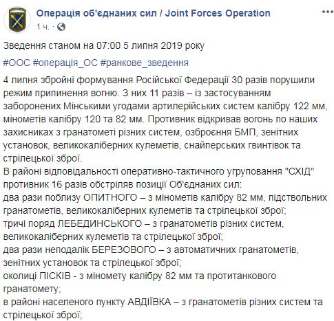 Отмечается, что противник 30 раз нарушил режим прекращения огня, из них 11 раз - с применением запрещенных Минскими соглашениями артиллерийских систем калибра 122 мм, минометов калибра 120 и 82 мм. "Противник открывал огонь по нашим защитникам из гранатомета различных систем, вооружения БМП, зенитных установок, крупнокалиберных пулеметов, снайперских винтовок и стрелкового оружия", - отмечается в сводке по состоянию на 07:00 5 июля.