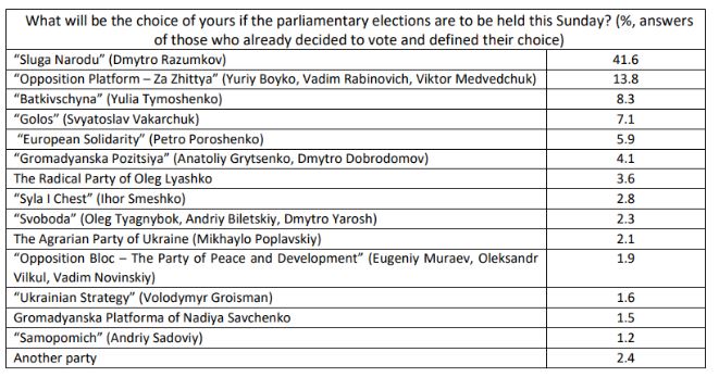 По результатам опроса, если бы парламентские выборы состоялись в ближайшее воскресенье, шансы на попадание в следующий состав украинского парламента получили бы следующие партии: "Слуга народа" Дмитрия Разумкова (41,6%), "Оппозиционная платформа - За жизнь" Юрия Бойко, Вадима Рабиновича и Виктора Медведчука (13,8%), "Батькивщина" Юлии Тимошенко (8,3%), "Голос" Святослава Вакарчука (7,1%) и "Европейская солидарность" Петра Порошенко (5,9%).