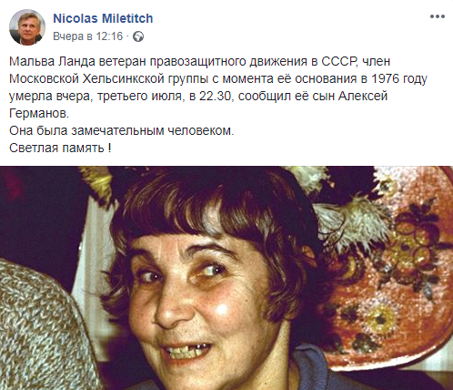 В среду, 3 июля, в возрасте 100 лет в Хайфе умерла самая старая участница правозащитного движения в СССР Мальва Ланда. Об этом со ссылкой на ее сына Алексея Германова сообщил в Facebook режиссер Николя Милетич.